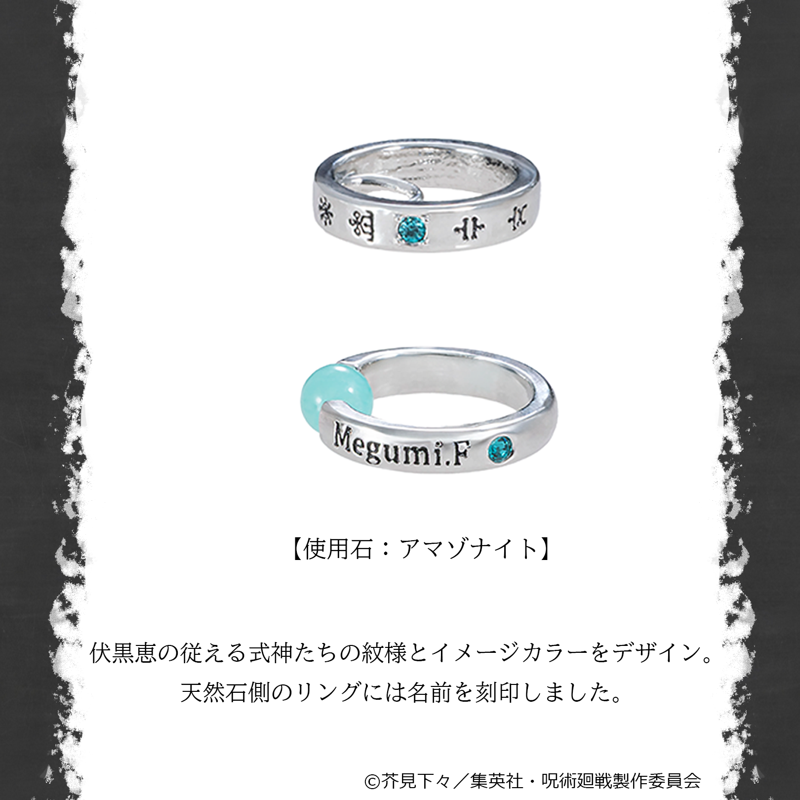 天然石はアマゾナイトを使用しています。天然石側のリングには”Megumi.F”の名前を刻印。