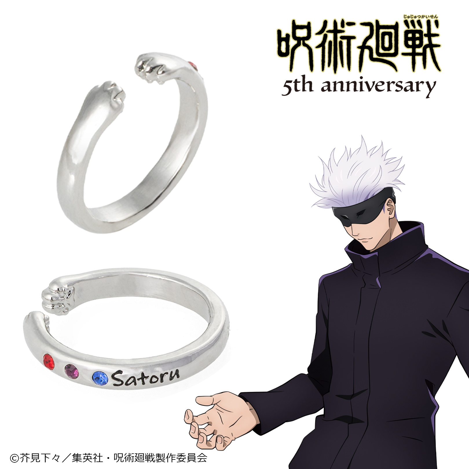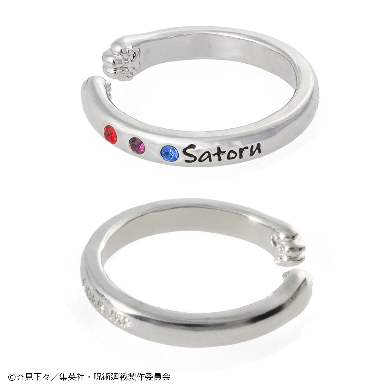 立体的な猫の手には五条悟の「蒼」「赫」「茈」をイメージした三色のストーンをセッティング。
