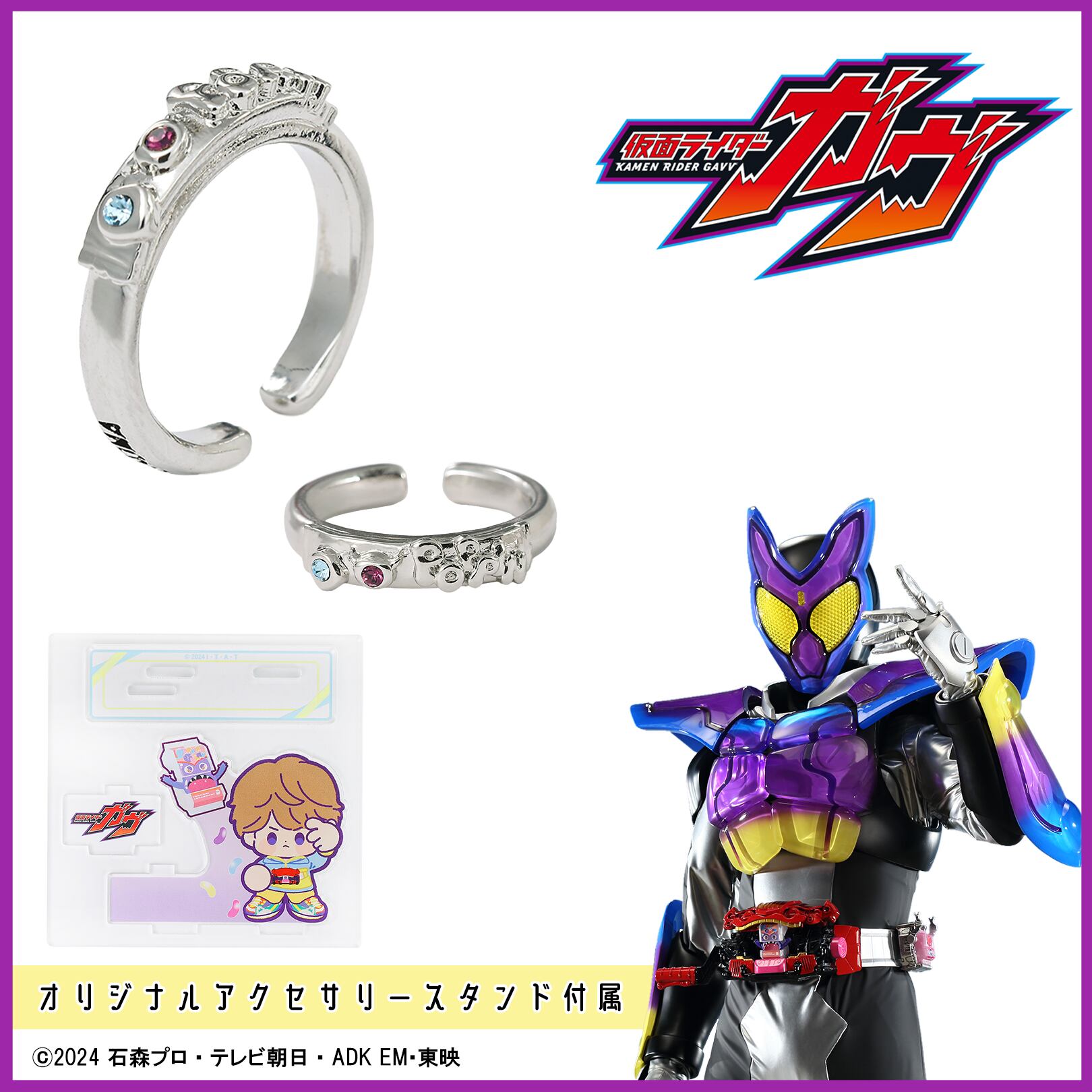 ショウマが変身する仮面ライダーガヴのモチーフとなっているグミをベースに、カラフルな石をセッティングしてポップなデザインに仕上げました。