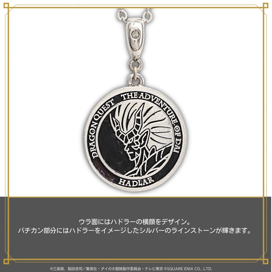 バチカン部分には表面に竜闘気(ドラゴニックオーラ)をイメージしたブルーのラインストーン、裏面にはハドラーをイメージしたシルバーのラインストーンが輝きます。