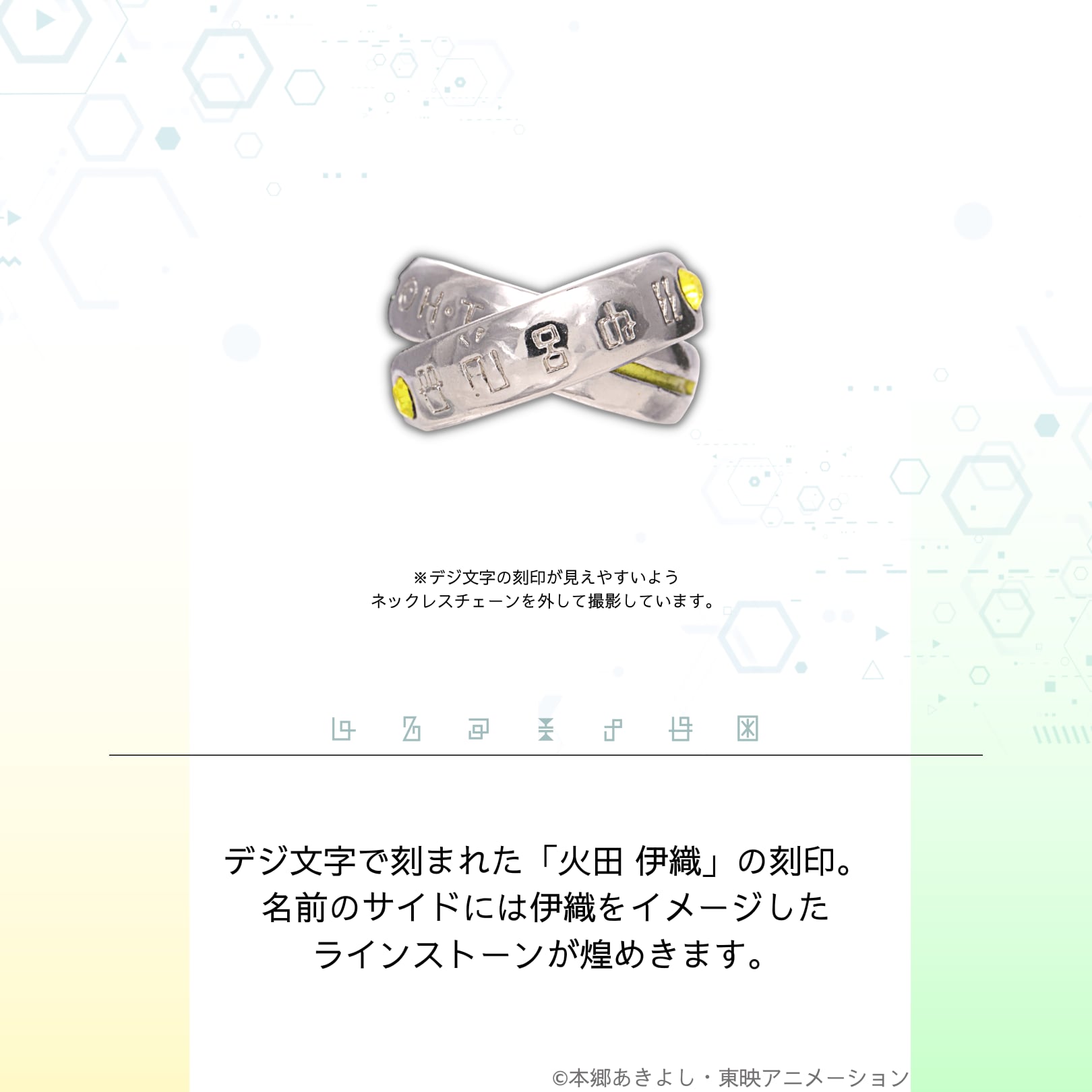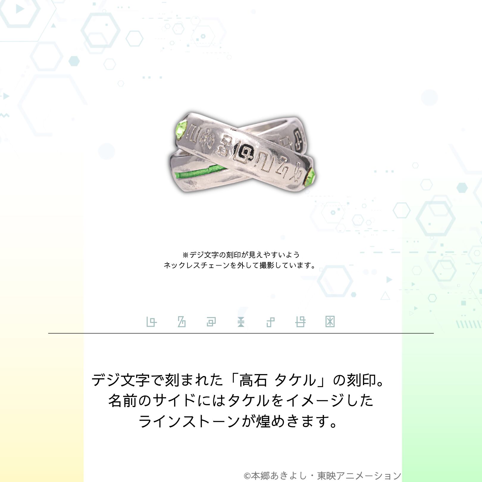 ジョグレス進化を表現した2つのリングには、デジ文字で「シャッコウモン」「火田伊織」「高石タケル」と刻まれています。