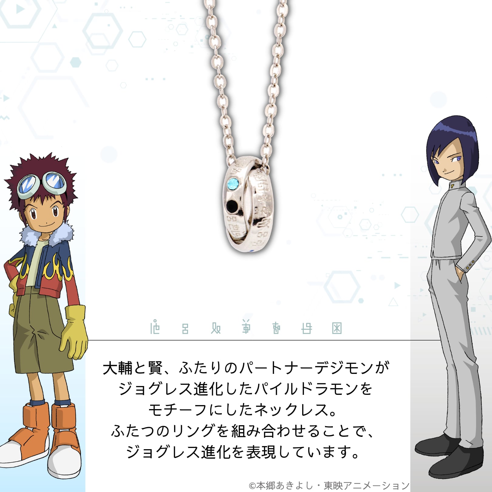 ジョグレス進化を表現した2つのリングには、デジ文字で「パイルドラモン」「本宮大輔」「一乗寺賢」と刻まれています。